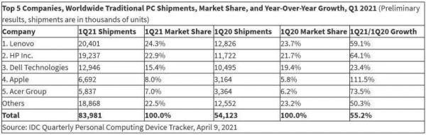▲2021年第一季度全球PC出货情况,数据来源:IDC