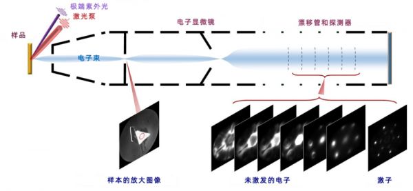 研究人员所使用的实验装置在一开始会用初始激光泵所发射的激光来激发电子,从而产生激子;紧接着,第二束高能激光脉冲将激子中的电子踢出,进入电子显微镜的真空中;接下来,电子显微镜可以测量电子离开材料的能量和角度,以确定电子在激子内的动量。| 图片来源:OIST