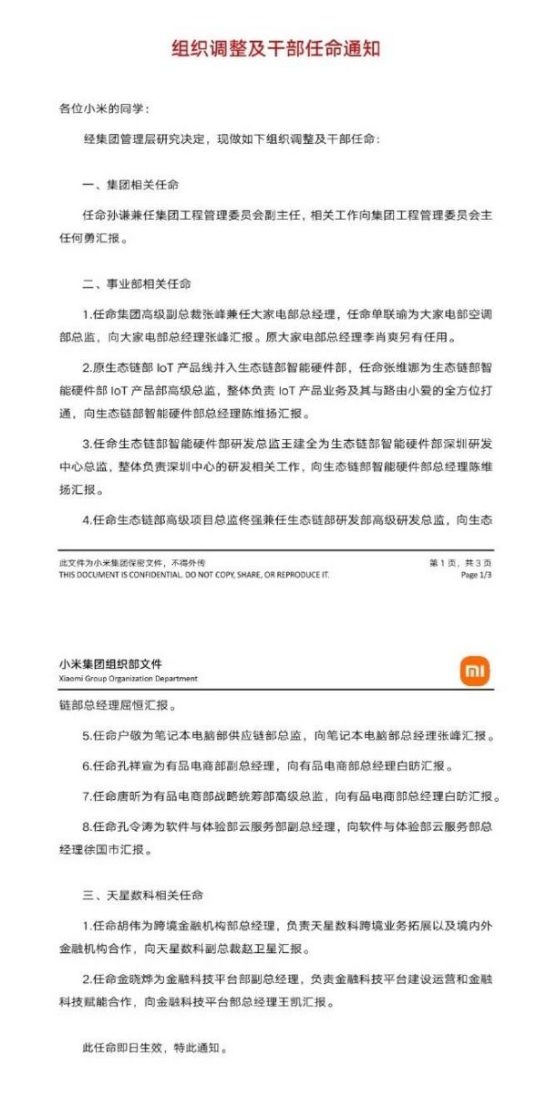 据36氪获得的一份文件显示,小米集团于上周公布最新的组织调整和干部任命。除了集团层面,生态链部门、有品商城及小米集团旗下数字科技服务平台“天星数科”(原小米数科)也有多项人事变动。一位生态链内部人士向36氪确认了此文件的真实性。