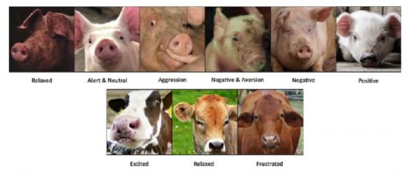 然后,我们就需要把农场动物的情绪进行分类,比如猪有6种情绪,牛有3种情绪等,再根据牛、猪的耳朵姿势、眼白等面部特征的相关性,将采集到的分组图像数据集分为9类,包括放松、警惕、兴奋等。