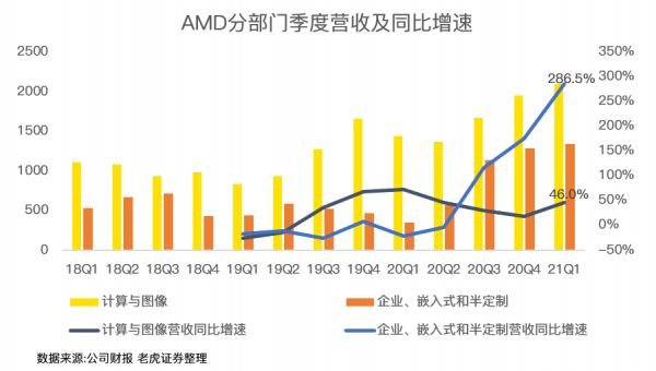 企业、嵌入式和半定制业务一季度营收可谓爆炸式增长,共斩获13.45亿美元营收,同比增速达286.5%。