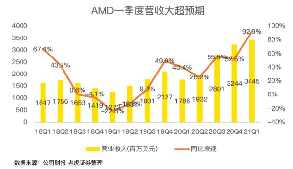 财报显示,一季度AMD斩获34.45亿美元营收,创下历史记录,同比增长92.9%,创近年来营收增速新高。