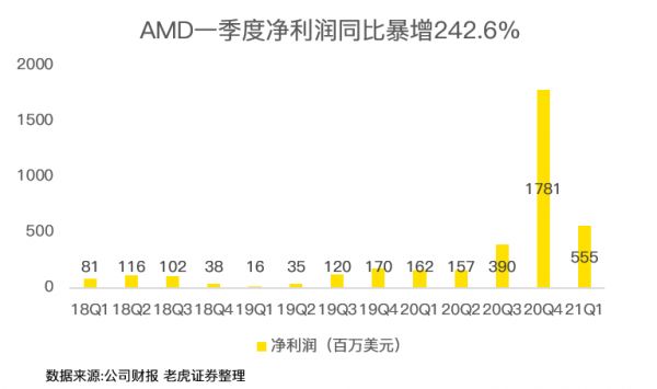 净利润方面,AMD一季度狂揽5.55亿美元,同比暴增242.6%。尽管去年四季度AMD净利润高达17.81亿美元,但其中13亿美元为所得税收益,属于一次性事件。因此,相较多年前接近破产的局面,AMD的净利润开始明显向好。