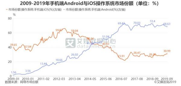 艾媒咨询数据显示,2019年手机端Android操作系统市场份额达68.63%,而同期iOS操作系统的市场份额为30.99%