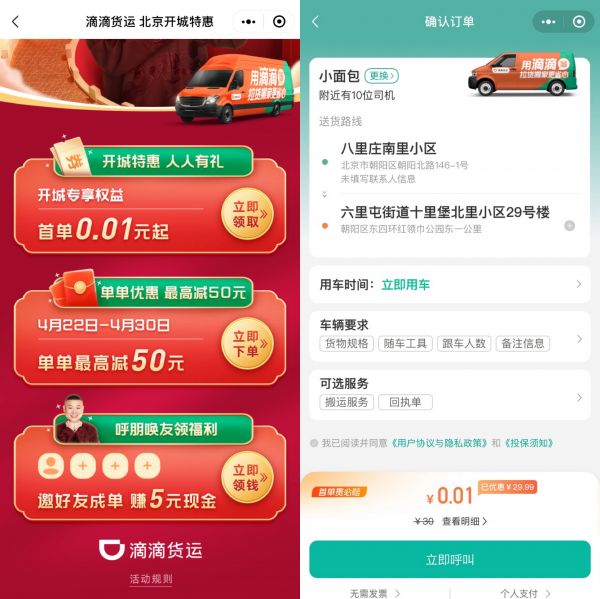 也就是说,以北京5公里30元的起步价计算,用户在5公里范围内用滴滴货运搬家、运货只需要1分钱。