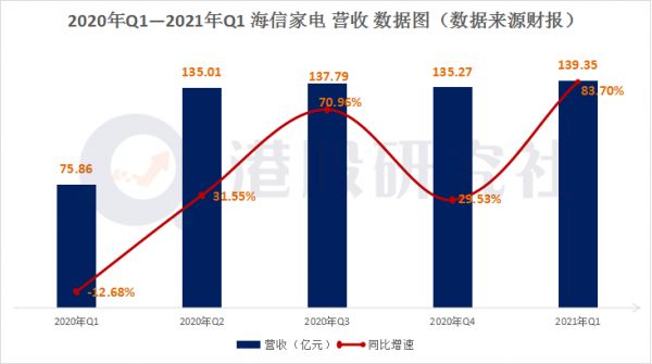 从披露出的财报数据可知,海信家电营收实现进一步增长,2021年一季度海信家电营收为139.35亿元人民币,同比2020年一季度的75.86亿元增长83.70%。