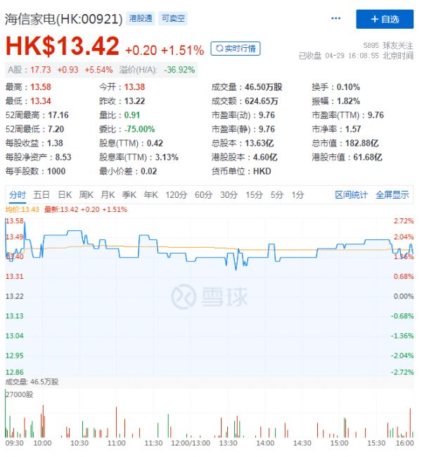 受此消息影响,4月29日港股开盘,海信家电股价走势较好,一度涨超2.73%,截止当日收盘,海信家电涨幅达1.51%,A股涨幅达5.54%。