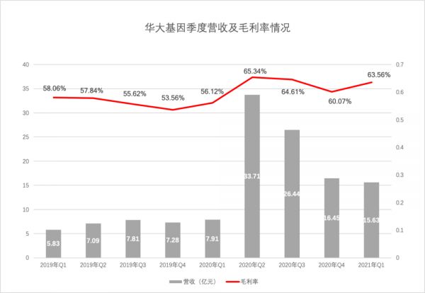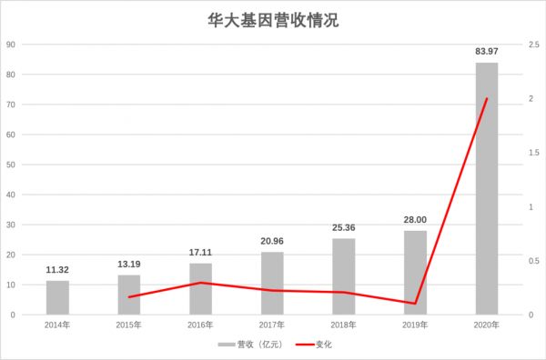 毕竟从 2016 年之后,华大基因的营收增速每年都在递减,从 30% 一路跌到 2019 年的刚过 10%。有过去几年增长疲软的衬托,2020 年其营收接近 200% 的涨幅就更显可贵。