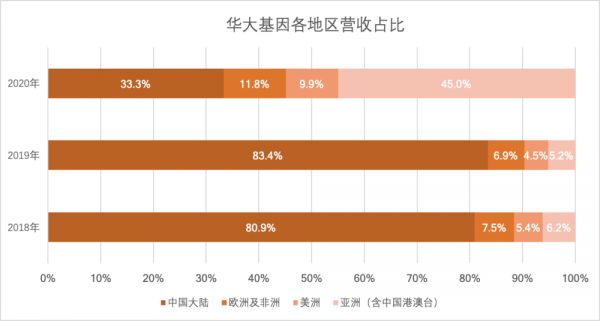这些输出海外的检测产品和实验室,无疑给公司的营收贡献了大大的一笔。按比例来看,华大基因在港澳台及海外地区的营收提升了 50%,首次反超大陆,并实现了大幅压制。