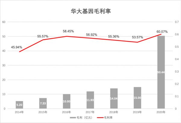 营收增长的同时,华大基因的毛利率也在 2020 年等来了一次小突破,首次突破了 60% 大关。虽然不及经常被拿来比较的基因检测第一股达安基因的 70.8%,但因为业务范畴不同、营收规模不同,这也只能作为一个参考。
