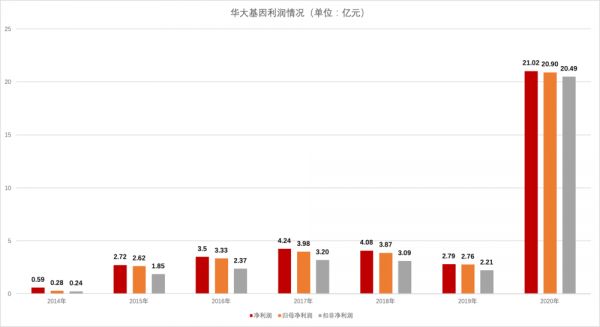 去年,华大基因全年营收 83.97 亿元,比 2019 年翻了近三番;扣非净利润 20.49 亿元,更是大涨 8 倍有余。