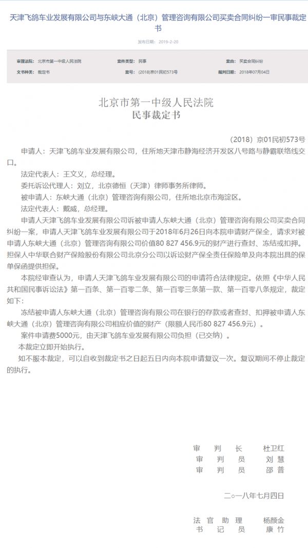 36氪讯,北京法院审判信息网公开信息显示,在ofo和天津飞鸽的合同中,ofo运营主体东峡大通(北京)管理咨询有限公司共计8082.75万元的银行存款和相应财产被冻结。天津飞鸽和ofo的买卖合同纠纷案于2018年6月20日立案。