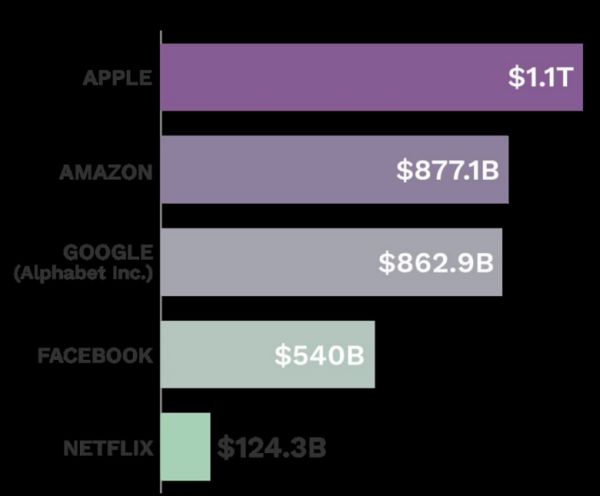 从本周二谷歌母公司公布了一份亮眼的财报开始,美股中排名靠前的科技互联网企业都要陆续展示自己的季度营收成绩了。截至本周三,在五大科技股FAANG之中,苹果的位置依然难以撼动,以2.24万亿美元高居榜首;亚马逊以1.74万亿美元市值名列亚军,谷歌母公司Alphabet以1.60万亿美元市值紧随其后;在万亿俱乐部的门外,Facebook以8725亿美元市值排在第四位,最后一名是Netflix,市值为2245.92亿美元。