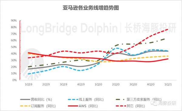 d.以亚马逊Prime 会员为主的订阅服务收入本季度76亿,同比增长36%,比上季度小幅加速。