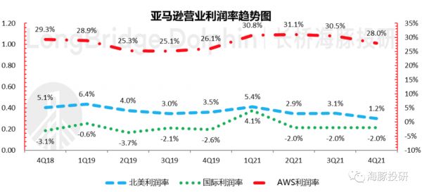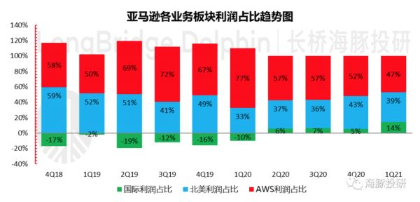 经营利润方面,海豚君基于财报把亚马逊的利润来源分为北美零售业务利润、国际零售利润和AWS的业务利润。