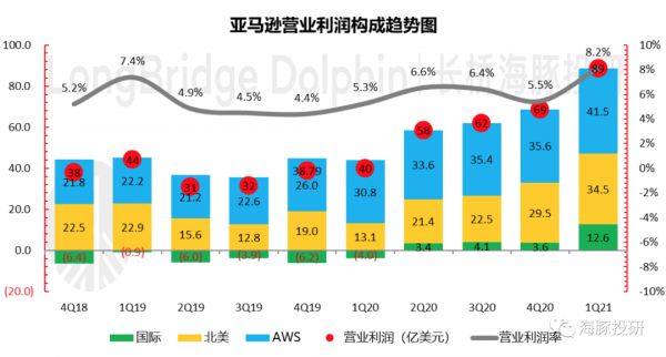 亚马逊于北京时间4月30日早晨公布2021年第一季度财报。本季度收入1085亿美元,同比增速与上季度一样,保持在了44%,超出了彭博一致预期的1045亿美元;经营利润89亿,远远超过了市场预期61亿。