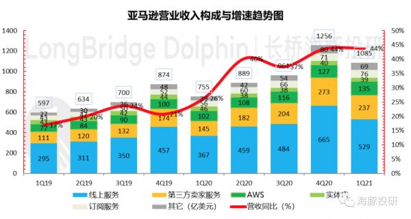 a. 本季度亚马逊营收1085亿美元,超越公司指引上限1060亿,以及市场预期均值1045亿美元;在单季同比增长高达44%,大体量下依然高速增长非常难得。