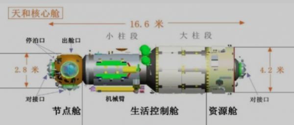 核心舱可细分为节点舱、生活控制舱和资源舱。节点舱上有对接口,可用于和“神舟”载人飞船的交会对接、空间实验舱的停泊和航天员的出舱。生活控制舱为航天员工作、实验和休息提供空间,而资源舱负责提供能源保障和对接“天舟”货运飞船。