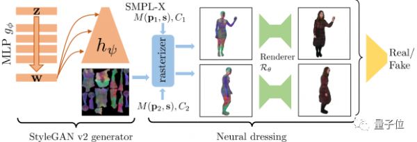 StyleGAN部分使用反向传播算法生成神经纹理,然后将其叠加在SMPL-X网格上,并使用神经渲染器进行渲染。