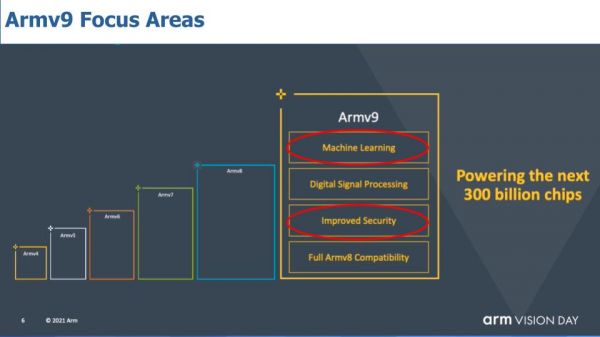 Armv9 可向后兼容前几代产品,这也许是从英特尔在 Itanium 处理器上的失败中学到的经验,没有向后的兼容性会很容易陷入困境。此外,ARM 添加了一些附加功能,注意上图中的标注:3000 亿个芯片。