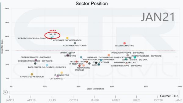 上图显示了 ETR 调研的 1200 多个访问对象的支出数据情况,ML / AI 在纵轴上排在首位,衡量支出速度的指标是净分(Net Score);横轴是市场份额或数据集中的占比,显示调查数据中每个季度的情况。