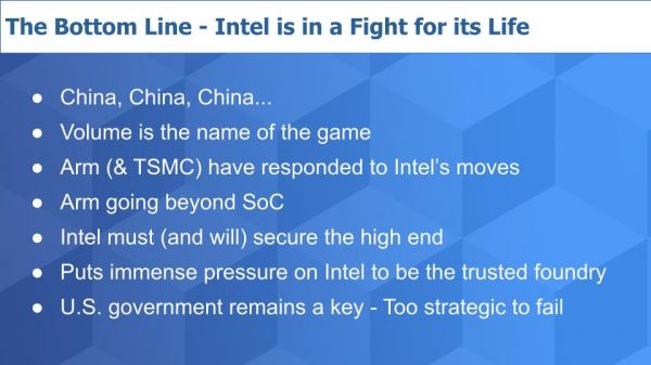 ARM 展示了超越 SoC 的野心,尽管其采用了完全外包的策略。英特尔将保持其在市场上的高端地位,但是 ARM 也会不停地大步开拓领地。英特尔最大的优势在于其集成设备制造或 IDM 战略,垂直整合(Vertical integration)是一个漫长的过程,并带来质量和成本方面的优势。但是如果没有批量生产,英特尔将在成本上失去竞争力,也许会破产,其中压力自不必说。