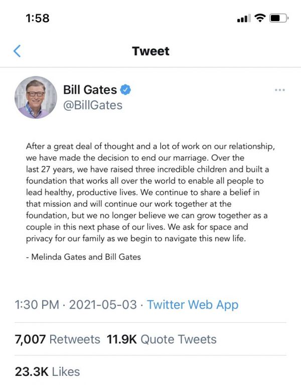 消息最先始于比尔·盖茨夫妇的联合推特声明——5月3日下午,盖茨在推特写道: