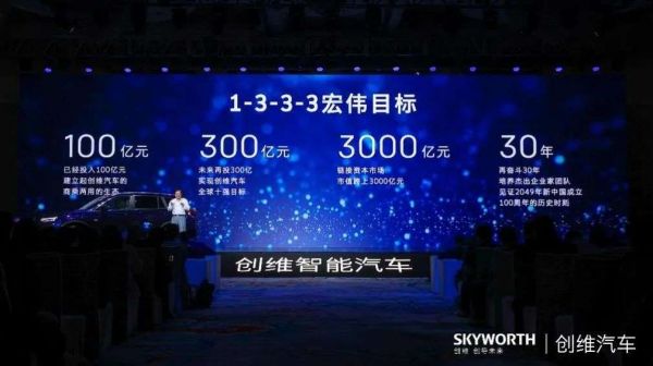 在发布会上,黄宏生为创维汽车定下了“1-3-3-3”目标。即投入100亿建立创维汽车生态;未来再投300亿实现创维汽车全球十强目标;市值达到3000亿元;再奋斗30年,培养杰出企业家团队,见证2049年新中国成立100周年时刻。