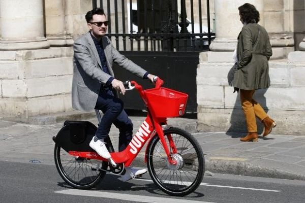图示:巴黎街头,一名男子使用Uber的电动自行车出行。