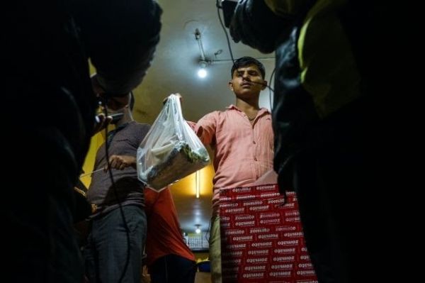 图示:新德里的一名外卖员通过外卖应用接单送餐