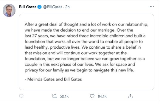 盖茨和梅琳达3号下午4:30, 同时在各自的推特发表了同一份声明。