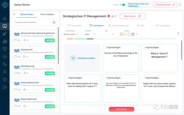 “此外,根据学生的学习方式,平台还会通过诸如智能抽认卡学习算法之类的东西来个性化学习过程。这是基于间隔重复的学习原理。例如,如果学生正在对微观经济学进行自我测试,则抽认卡集将经历不同的问题和答案,并且学生可以像与Tinder相似的方式在抽认卡上滑动。抽认卡的顺序将在每次响应后进行调整。
