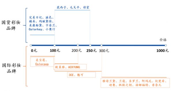 各彩妆品牌核心价格带对比。数据来源:国元证券