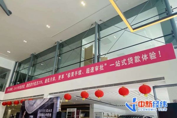 近日,中新经纬(微信号:jwview)走访时也注意到,4S店对贷款买车的宣传几乎无处不在:墙上贴着醒目的横幅,前台放了宣传小册子,某家4S店的洽谈桌上还贴着这样一则标语,“亲,您确定全款吗?贷款无利息哦!”