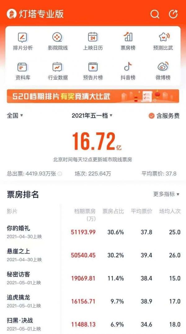 10余部影片成为炮灰的同时,《你的婚礼》和《悬崖之上》横向竞争也异常激烈。五一当天,《你的婚礼》日票房超过《悬崖之上》近一倍,但困于口碑,5月3日起,《悬崖之上》就开始反超《你的婚礼》,连续两日获得日票房冠军,5月5日其势头依旧很强。
