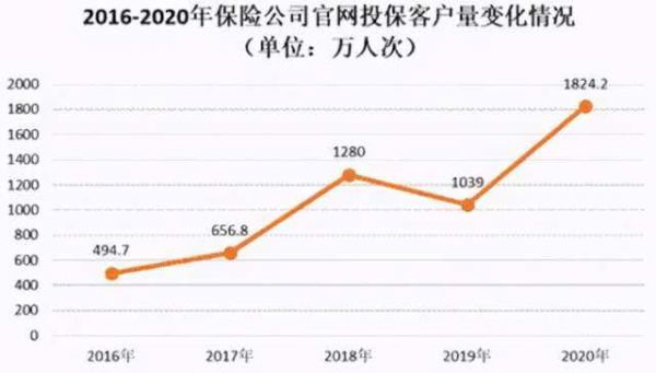根据数据显示,保险公司官网投保客户量在这几年出现迅猛增长的态势,客户量从2016年的494.7万人,增长到2020年的1824.2万人。