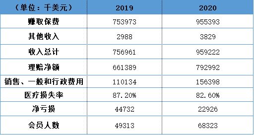 2020年,公司赚取保费9.55亿美元,较2019年的7.54亿美元增长26.7%。医疗费用支出方面,2019年支出为6.61亿美元,2020年支出7.93亿美元,同比增长19.9%。2019年医疗损失率为87.2%,2020年这一比例降为82.6%,与行业水平基本相当,也体现了Alignment的AI模型在降低损失率方面的举措有成效。