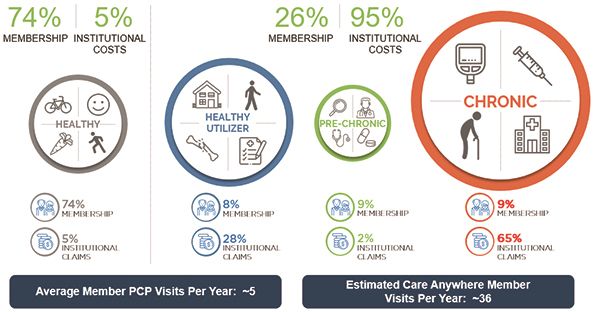 其中,AVA最突出的一个功能是根据会员的既往病史、健康状况和需求等数据,将会员分成四类,健康体(Healthy)、意外事故人群(Healthy Utilizer)、即将罹患慢病的群体(Pre-Chronic)和慢病群体(Chronic),确定最需要护理的成员,并部署Care Anywhere团队,在会员的家中、医疗机构或通过虚拟渠道提供及时、有效的护理。