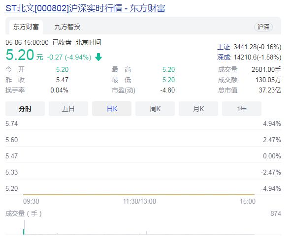 5月6日,ST北文今日复牌一字跌停,截至收盘,报5.20元/股,总市值仅剩37.23亿元。