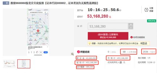 且,近1000万股北京文化的股权将于5月17日上线拍卖,起拍价约为5316.83万元。拍卖页面还标明了风险提示:1、因股票总价值较高,参拍出价需慎重,一旦竞买成功,悔拍将承担严重不利后果;2、股票划转过户相关限制政策咨询证券管理机构政策制定。