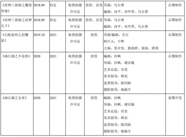 其中,电影《封神三部曲》作为华语电影中首次采取三部连拍模式进行制作的系列电影,项目跨度长达十年,一度被誉为中国电影工业化新标杆,报告期内影片外景拍摄已全部杀青,截至本报告披露日正在后期制作中,计划2021年上映。