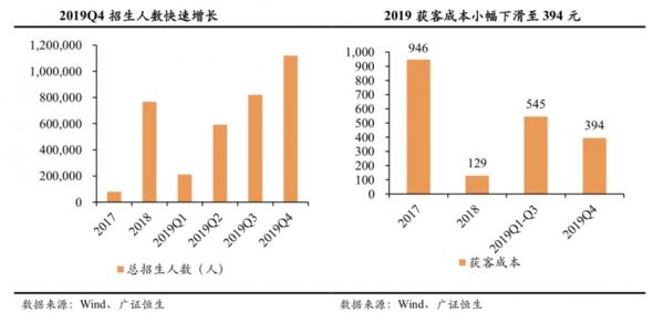 在2019年第四季度,跟谁学招生人数达到112万,同比增长290.2%,而其中K12付费大班在读人数增速达到410%;2019年全年招生人数274.3万人,而获客成本下降至394元。