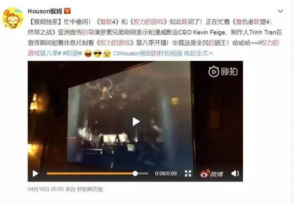 我这么猜可不是没道理,《权游》第八季刚开播的时候,正在忙着《复联4》宣传的导演罗素兄弟和漫威老大凯文·费奇,就忙里偷闲把《权游》给看了。