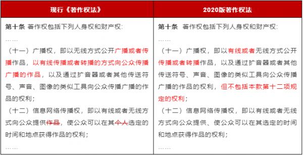 这些问题在新《著作权法》中得到了一定解决。第十条的广播权加上了“有线或者无线方式”的表述,将涉及范围扩展到了直播等互联网形式。此外,新增第五十一条中明确指出“知道或者应当知道作品、版式设计、表演、录音录像制品或者广播、电视上的权利管理信息未经许可被删除或者改变,仍然向公众提供”,明确平台责任。