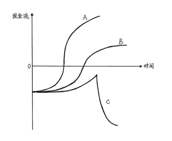 A线是理想的结果,"烧钱"虽多,但能用较短的时间达到盈亏平衡点,并且未来能赚到大钱,比烧的钱多很多。B线和A线不同,烧同样多的钱,企业需要更长时间达到盈亏平衡点,之后赚钱能力却一般。而C线代表的是,烧完了钱也没能跨过盈亏平衡点,企业最终死掉了。