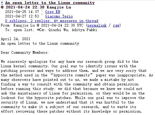 可在整所学校都被 Linux 禁止参与内核开发后,或许是意识到事情闹大了,Kangjie Lu 教授以及涉事学生 Qiushi Wu 和 Aditya Pakki 联合署名发表了一封致 Linux 内核社区的公开道歉信:“对于我们的研究小组对 Linux 内核社区造成的任何伤害,我们深表歉意。”