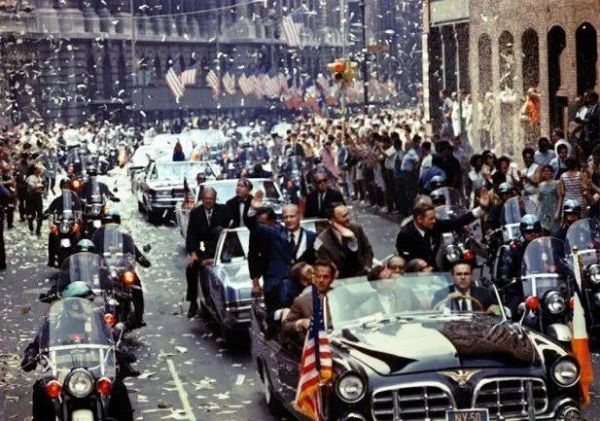 在纽约曼哈顿举行的盛大游行。第一辆车上站着的是3位航天员,站在中间的是柯林斯,左右分别是奥尔德林和阿姆斯特朗|NASA