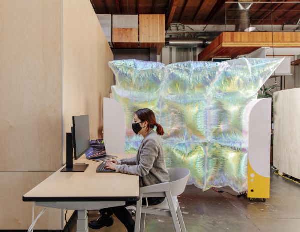 如果一场会议的隐私级别较高,一个“隐私机器人”就会过来给半透明的气球墙充气,防止路过的人们窥探会议内容。这个机器人看起来像一台带轮子的电脑内部装置,配备了可以探测周围环境的传感器。