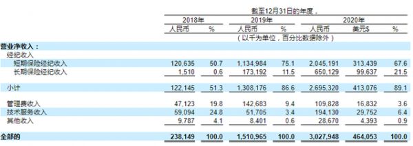 招股书显示,水滴的营收主要来自三方面,分别是水滴保贡献的保险经纪收入、来自水滴互助的管理费收入和面向保险公司等机构收取的技术服务费。2020年,仅水滴保贡献收入占比就接近9成。
