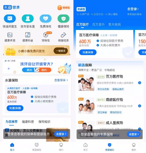 水滴健康App则提供了“健康”和“保险”服务,其中,在健康板块,集合了找名医问诊、体检等业务,保险板块则提供了健康保险购买服务。